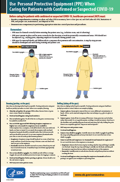 If reuse of respirators is necessary, an appropriate sequence for donning/doffing procedures should be used to prevent contamination, and training needs to address appropriate donning/doffing procedures. See www.cdc.gov/niosh/npptl/pdfs/PPE-Sequence-508.pdf.