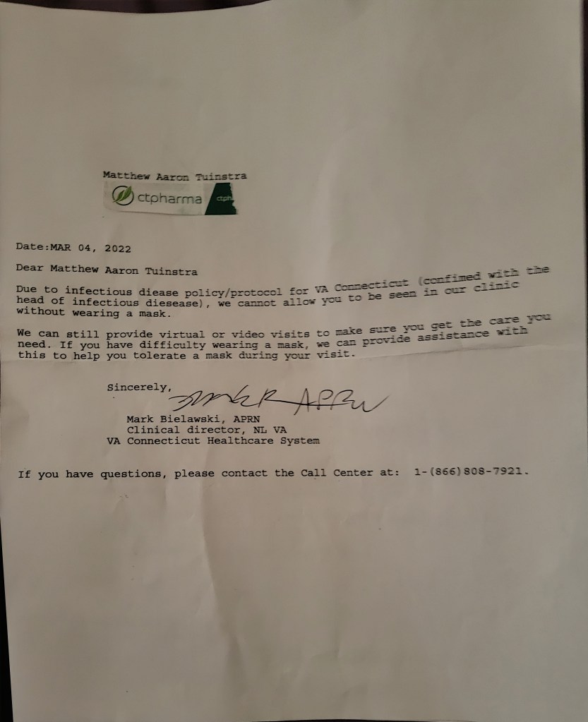On Dec 2nd 2021 I was refused Medical treatment via Veterans Affairs. At this point in Time it had been 2 weeks since the Veterans Affairs Commissioner reported any positive results of SARS-COV, the total who did test positive was 76 Staff and 74 patrons where 5 patrons died with 2 staff members. I have been keeping track.