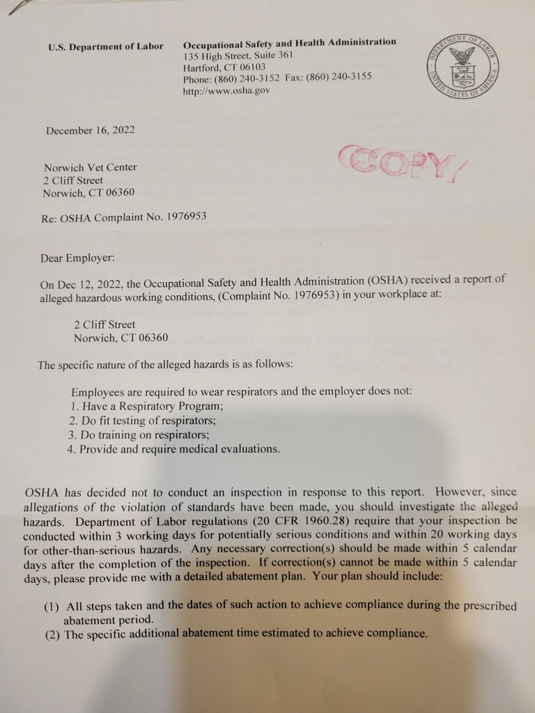Which states employees at the Norwich vet center are not required to use respirators, which is false. I have spoken to several employees who state that Jamie Harnandez the Director first forced them to use loosfitting surgical masks, which isn’t allowed because of