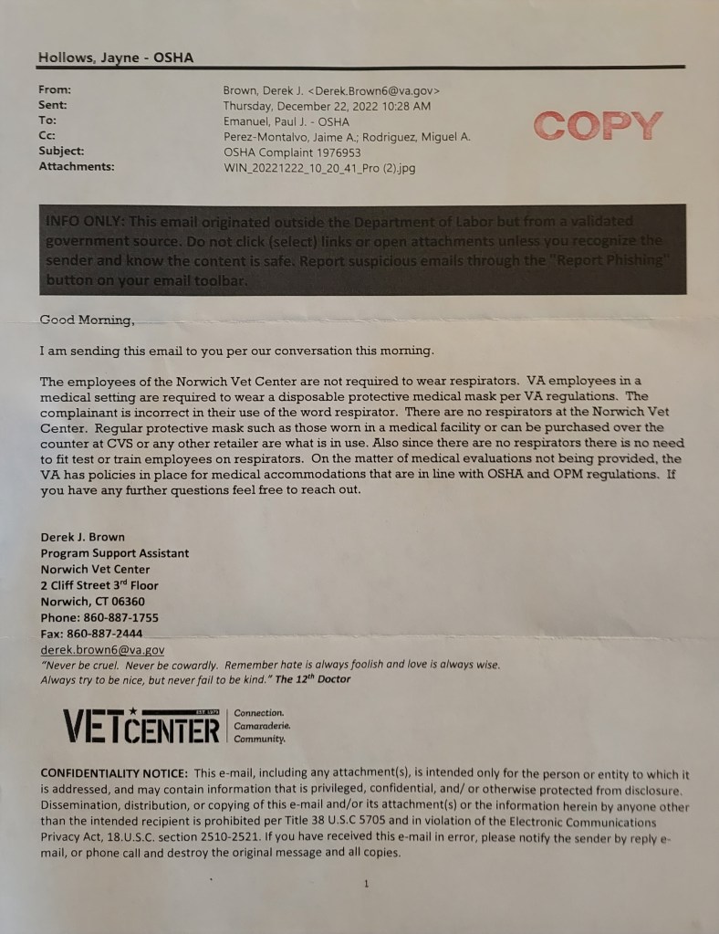 I have also filed a grevance about the VA when Dr. Kauffman threatened me for talking about the masks when he told me he puts it in his pocket when not walking the halls, which was 100% aginst all the spandards given by OSHA, CDC, & FDA altogether. The letter from from Brown, Derek J. Also says “The VA has medical has policies in place for medical accommodations” this doesn’t remove the requirement to have it on file, and the training records, the Fit Yesting, or the Medical Evaluations like a letter from the PLHCP which will state the use and limitations for the individual.